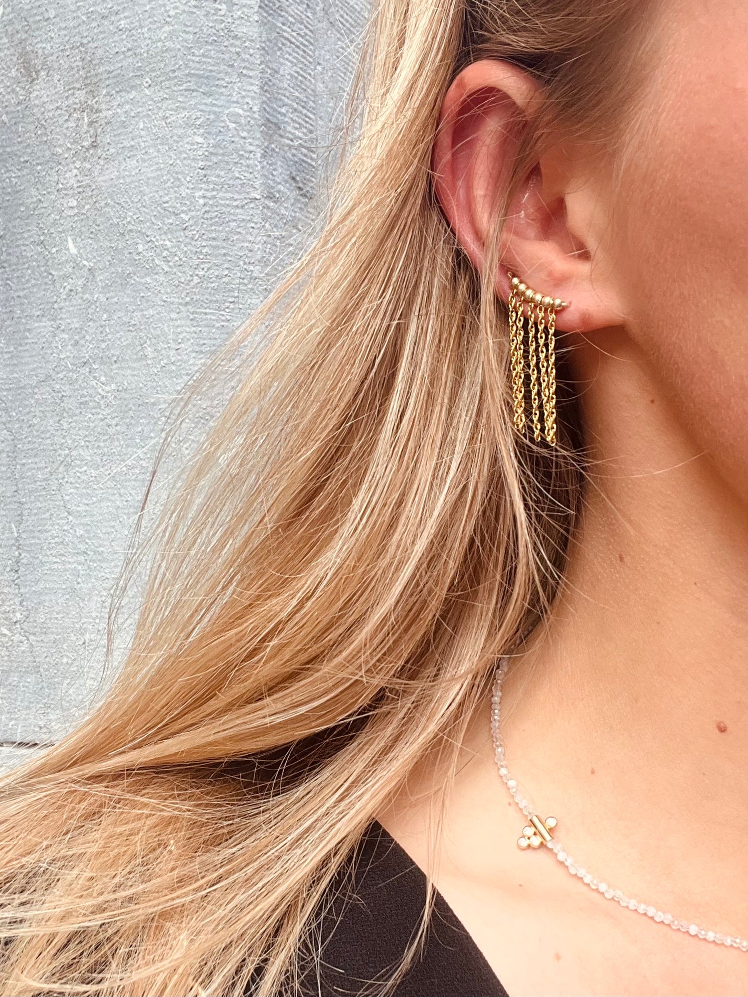 Grace à la résistance des matériaux utilisés, la boucle d'oreille montante vous accompagnera à toutes vos plus belles soirées et événements en habillant votre oreille d'une jolie robe dorée.