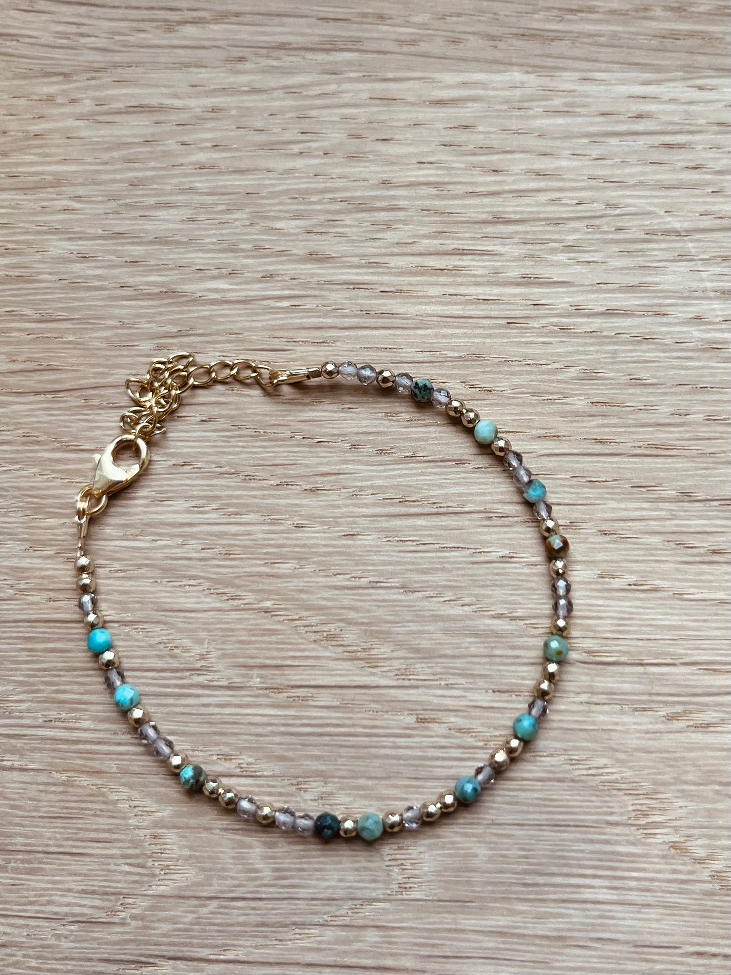 Joli bracelet en pierre fines turquoise, quartz et doré.